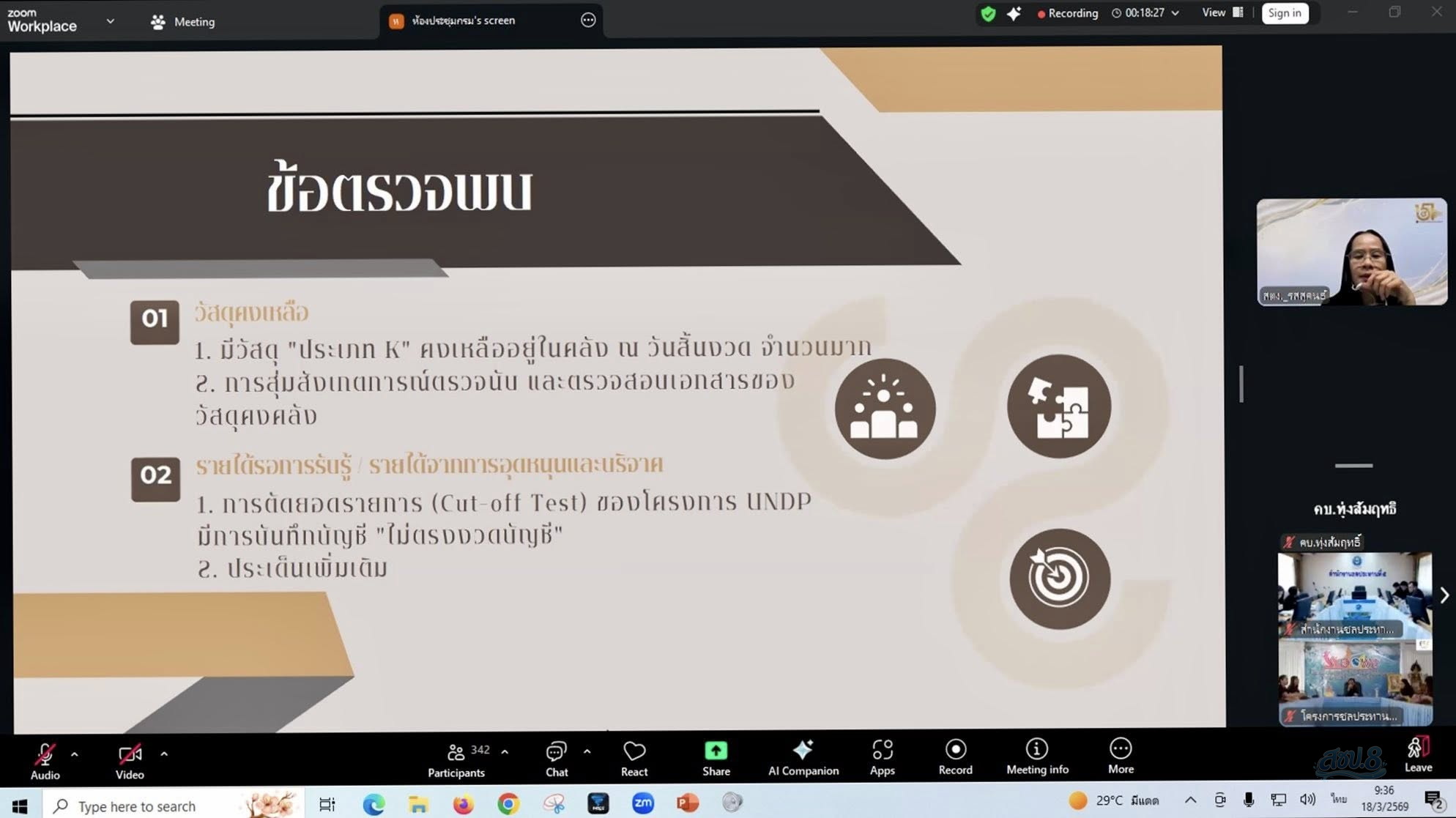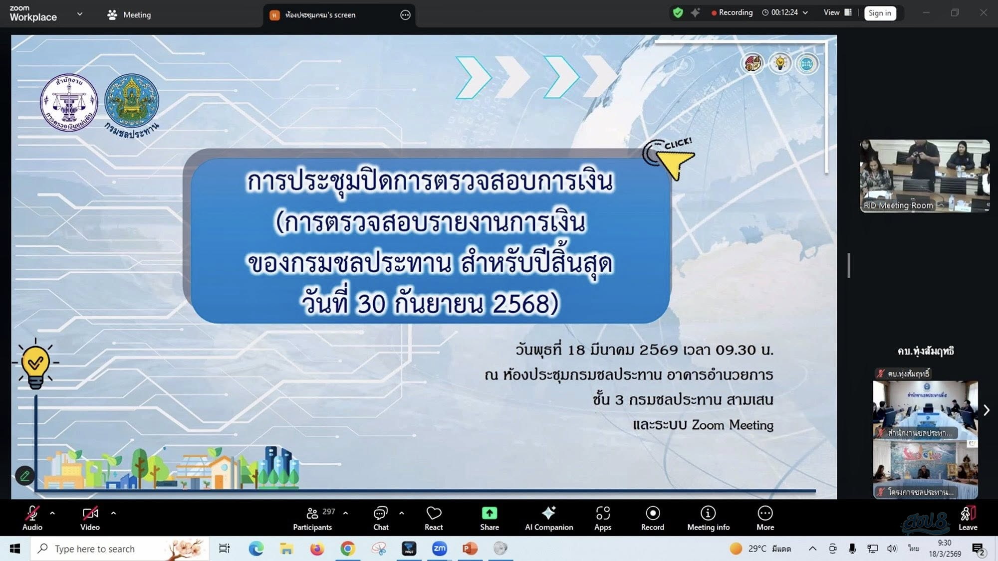 วันพุธที่ 18 มีนาคม 2569 เวลา 09.30 น. นายปิยภัทร สายเมฆ ผู้อำนวยการโครงการส่งน้ำและบำรุงรักษาทุ่งสัมฤทธิ์ มอบหมายให้ นายนิรุตติ พันธุโอสถ หัวหน้าฝ่ายวิศวกรรม และ นายจักรกฤษ เครือวัน นายช่างชลประทานปฏิบัติงาน เข้าร่วมประชุมปิดการตรวจสอบการเงิน (การตรวจสอบรายงานการเงินของกรมชลประทาน สำหรับปีสิ้นสุดวันที่ 30 กันยายน 2568) ผ่านระบบออนไลน์ Zoom Meeting จากห้องประชุมกรมชลประทาน ชั้น 3 อาคารอำนวยการ กรมชลประทาน สามเสน กรุงเทพฯ โดยมี นายชุติมันต์ สกุลพราหมณ์ ผู้อำนวยการกองแผนงาน เป็นประธานการประชุม ซึ่งการประชุมในครั้งนี้เพื่อให้หน่วยงานได้รายงานชี้แจงในประเด็นต่างๆ อีกทั้งเพื่อให้การดำเนินงานตรวจสอบเป็นไปตามระเบียบ ภายใต้แนวทางการปฏิบัติงานตามมาตรฐานการตรวจสอบที่สอดคล้องกับการบริหารงานภาครัฐ ต่อไป ณ ห้องประชุมโครงการส่งน้ำและบำรุงรักษาทุ่งสัมฤทธิ์ ตำบลในเมือง อำเภอพิมาย จังหวัดนครราชสีมา