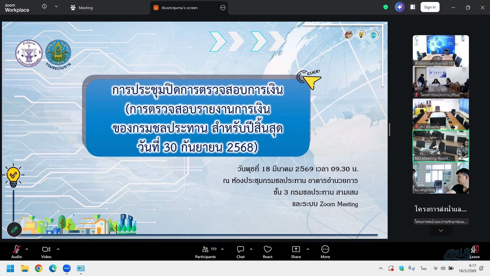 วันพุธที่ 18 มีนาคม 2569 เวลา 09.30 น. นายราเมศ พวงพรหม ผู้อำนวยการโครงการชลประทานบุรีรัมย์ มอบหมายให้ นางสาวอำภา รัตนสุภานันท์ หัวหน้าหน่วยการเงินและบัญชี และเจ้าหน้าที่โครงการฯ เข้าร่วมประชุม เข้าร่วมประชุมปิดการตรวจสอบการเงิน (การตรวจสอบรายงานการเงินของกรมชลประทาน สำหรับปีสิ้นสุดวันที่ 30 กันยายน 2568) ผ่านระบบออนไลน์ Zoom Meeting จากห้องประชุมกรมชลประทาน อาคารอำนวยการ ชั้น 3 กรมชลประทาน สามเสน กรุงเทพฯ โดยมี นายชุติมันต์ สกุลพราหมณ์ ผู้อำนวยการกองแผนงาน เป็นประธานการประชุม ซึ่งการประชุมในครั้งนี้เพื่อให้หน่วยงานได้รายงานชี้แจงในประเด็นต่างๆ อีกทั้งเพื่อให้การดำเนินงานตรวจสอบเป็นไปตามระเบียบ ภายใต้แนวทางการปฏิบัติงานตามมาตรฐานการตรวจสอบที่สอดคล้องกับการบริหารงานภาครัฐ ต่อไป ณ ห้องประชุม SWOC โครงการชลประทานบุรีรัมย์ ตำบลบ้านบัว อำเภอเมือง จังหวัดบุรีรัมย์