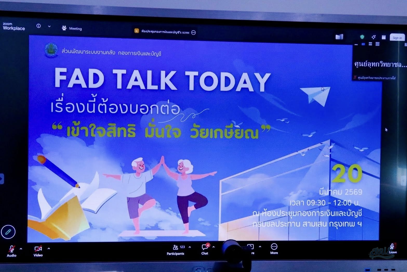 วันศุกร์ที่ 20 มีนาคม 2569 เวลา 09.30 น. นายราเมศ พวงพรหม ผู้อำนวยการโครงการชลประทานบุรีรัมย์ มอบหมายให้ นายสาโรจน์ เหง้าพรหมมินทร์ หัวหน้าฝ่ายจัดสรรน้ำและปรับปรุงระบบชลประทาน และเจ้าหน้าที่โครงการฯ เข้าร่วมกิจกรรม FAD Talk Today เรื่องนี้ต้องบอกต่อ หัวข้อ “เข้าใจสิทธิ มั่นใจ วัยเกษียณ” ผ่านระบบออนไลน์ Zoom meeting จากห้องประชุมกองการเงินและบัญชี กรมชลประทาน สามเสน กรุงเทพฯ โดยมี นางกนกวรรณ ธนาเลิศสมบูรณ์ ผู้อำนวยการกองการเงินและบัญชี เป็นประธานเปิดกิจกรรมฯ ซึ่งการจัดกิจกรรมในครั้งนี้ เพื่อให้ข้าราชการและเจ้าหน้าที่ที่เกี่ยวข้อง มีความรู้ ความเข้าใจเกี่ยวกับสิทธิประโยชน์ สวัสดิการ และการวางแผนการเงิน ตลอดจนแลกเปลี่ยนความคิดเห็นและประสบการณ์ซึ่งจะเป็นประโยชน์ต่อการวางแผนชีวิตหลังเกษียณ ต่อไป ณ ห้องประชุม SWOC โครงการชลประทานบุรีรัมย์ ตำบลบ้านบัว อำเภอเมือง จังหวัดบุรีรัมย์