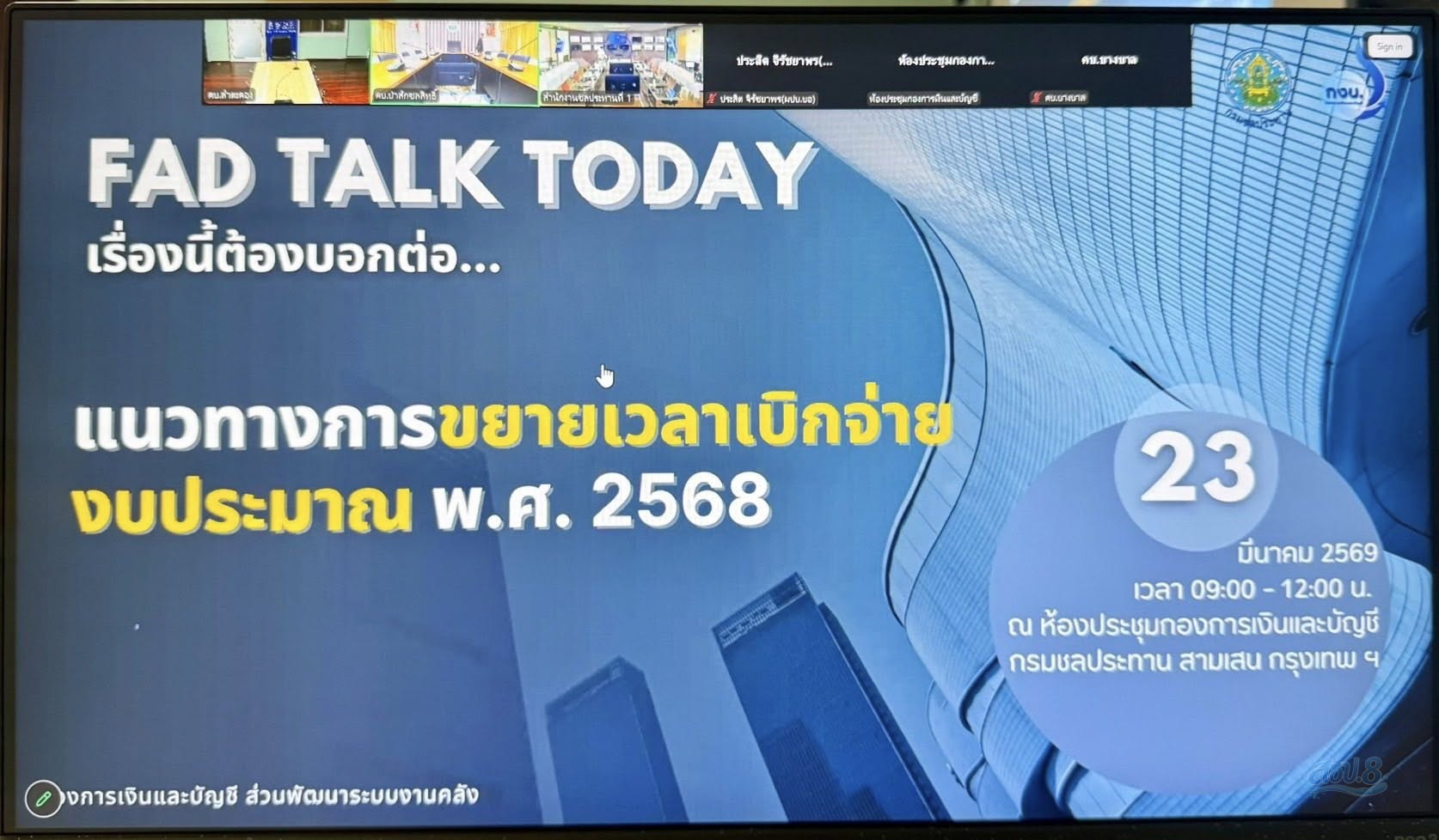 วันจันทร์ที่ 23 มีนาคม 2569 เวลา 09.30 น. นายไพฑูรย์ ยังรักษา ผู้อำนวยการโครงการส่งน้ำและบำรุงรักษาลำตะคอง มอบหมายให้ นายชยกร ฤทธิรอด หัวหน้าฝ่ายวิศวกรรม นายวรานนท์ เมืองมิ่ง นายช่างชลประทานปฏิบัติงาน และเจ้าหน้าที่ฝ่ายวิศวกรรม เข้าร่วมกิจกรรม FAD Talk Today เรื่องนี้ต้องบอกต่อเรื่องแนวทางการขยายเวลาเบิกจ่ายงบประมาณ พ.ศ. 2568 ครั้งที่ 2/2569 ผ่านระบบออนไลน์ Zoom meeting จากห้องประชุมกองการเงินและบัญชี กรมชลประทาน สามเสน กรุงเทพฯ โดยมี นางกนกวรรณ ธนาเลิศสมบูรณ์ ผู้อำนวยการกองการเงินและบัญชี เป็นประธานเปิดกิจกรรมฯ ซึ่งการจัดกิจกรรมในครั้งนี้เพื่อให้สำนัก กอง ศูนย์ กลุ่ม และสถาบัน ที่ยังไม่สามารถใช้จ่ายเงินได้เสร็จสิ้นหรือก่อหนี้ผูกพันได้ทันภายในสิ้นปีงบประมาณ พ.ศ. 2568 แต่มีความจำเป็นต้องใช้จ่ายเงินต่อไป โดยต้องดำเนินการขอขยายเวลาเบิกจ่ายเงินงบประมาณดังกล่าว ตามหลักเกณฑ์ วิธีการและภายในระยะเวลาที่กระทรวงการคลังกำหนด ณ ห้องประชุมโครงการส่งน้ำและบำรุงรักษาลำตะคอง ตำบลในเมือง อำเภอเมือง จังหวัดนครราชสีมา