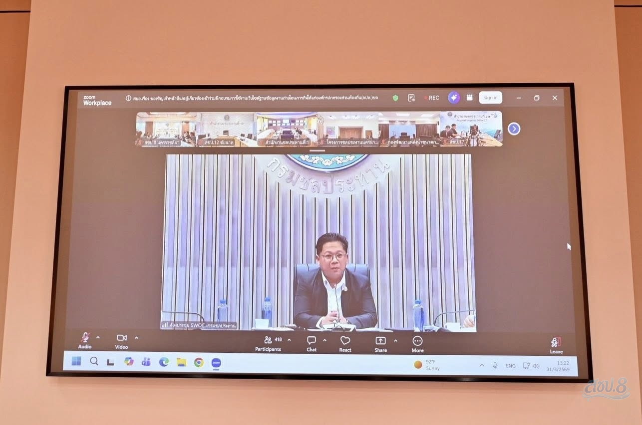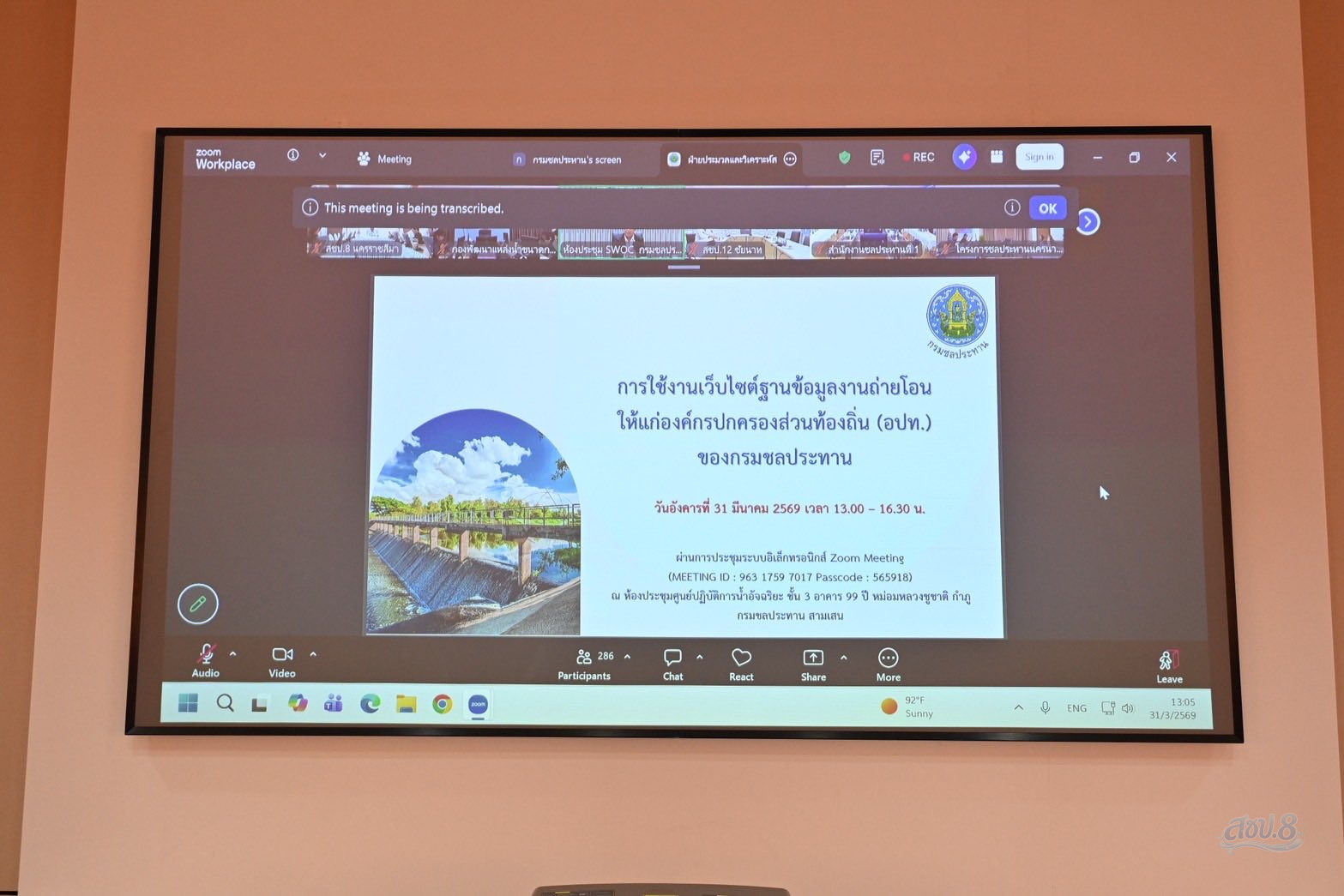 วันอังคารที่ 31 มีนาคม 2569 เวลา 13.00 น. นายกิตติธัช เทพหัสดิน ณ อยุธยา ผู้อำนวยการสำนักงานชลประทานที่ 8 มอบหมายให้ นายธีระศักดิ์ ประหยัด รองผู้อำนวยการสำนักงานชลประทานที่ 8 พร้อมด้วย นายวชิรพงษ์ เพ็งแก้ว ผู้อำนวยการส่วนแผนงาน นายคงฤทธิ์ สุภักดี ผู้อำนวยการส่วนบริหารจัดการน้ำและบำรุงรักษา นางสาวแก้วตา พะนิจรัมย์ ผู้อำนวยการส่วนบริหารทั่วไป หัวหน้าฝ่าย และเจ้าหน้าที่ที่เกี่ยวข้อง เข้าร่วมประชุมการใช้งานเว็บไซต์ฐานข้อมูลงานถ่ายโอนภารกิจให้แก่องค์กรปกครองส่วนท้องถิ่น (อปท.) ของกรมชลประทาน ผ่านสื่ออิเล็กทรอนิกส์ Zoom Meeting จากห้องประชุมศูนย์ปฏิบัติการน้ำอัจฉริยะ ชั้น 3 อาคาร 99 ปี หม่อมหลวงชูชาติ กำภู กรมชลประทาน สามเสน กรุงเทพฯ โดยมี ดร.ธเนศร์ อสมบูรณ์ ผู้อำนวยการสำนักบริหารจัดการน้ำและอุทกวิทยา กรมชลประทาน เป็นประธานการประชุมฯ ทั้งนี้มีวาระการประชุมเพื่อชี้แจงภาพรวมการถ่ายโอนภารกิจให้แก่องค์กรปกครองส่วนท้องถิ่น (อปท.) ของกรมชลประทาน แนะนำเว็บไซต์ฐานข้อมูล การสาธิตและฝึกปฏิบัติการใช้งานเว็บไซต์ พร้อมตอบข้อซักถามและแลกเปลี่ยนความคิดเห็น เพื่อให้การติดตามผลการถ่ายโอนภารกิจเป็นไปอย่างมีประสิทธิภาพ ณ ห้อง SWOC 8 ชั้น 4 สำนักงานชลประทานที่ 8 ตำบลในเมือง อำเภอเมือง จังหวัดนครราชสีมา
