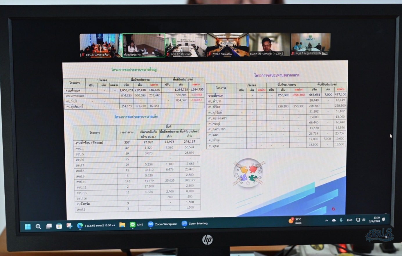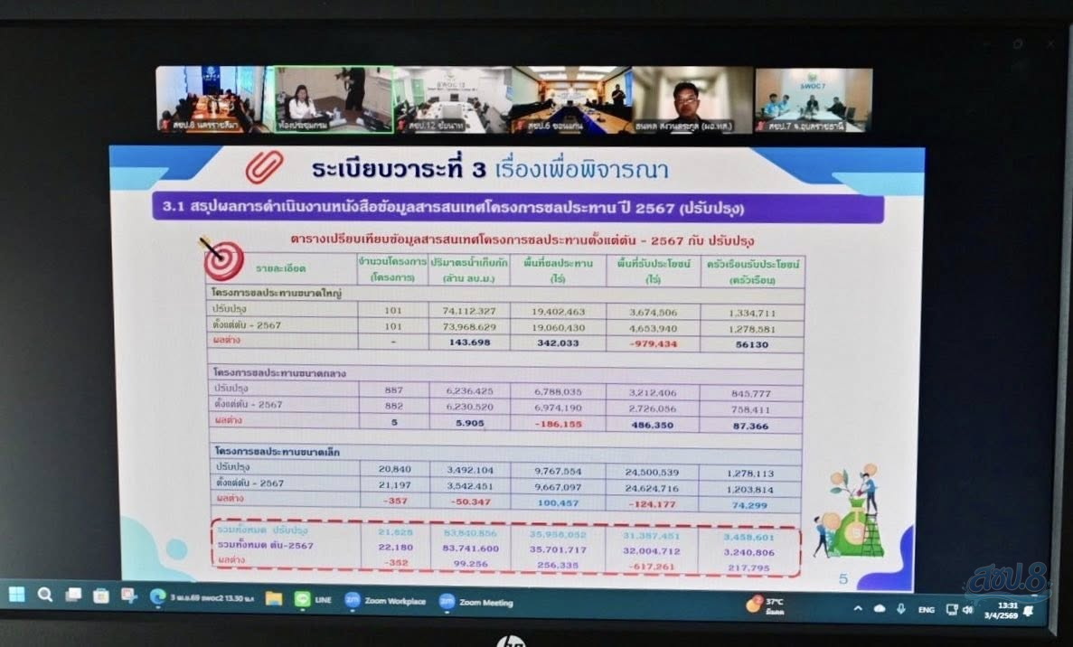 วันศุกร์ที่ 3 เมษายน 2569 เวลา 13.30 น. นายกิตติธัช เทพหัสดิน ณ อยุธยา ผู้อำนวยการสำนักงานชลประทานที่ 8 มอบหมายให้ นายธีรนันต์ เจริญศิริมณี หัวหน้าฝ่ายบริหารจัดการน้ำ พร้อมด้วย นายวันเรืองเดช เนาว์ประเสริฐ หัวหน้าฝ่ายแผนงานและงบประมาณ นายภาสวุฒิ ขอมเกาะ หัวหน้าฝ่ายปรับปรุงบำรุงรักษา นางสาวนันท์นลิน ลีลาน้อย หัวหน้าฝ่ายยุทธศาสตร์ นางสาวปนัดดา การินทร์ หัวหน้าฝ่ายโครงการพิเศษ และเจ้าหน้าที่ที่เกี่ยวข้อง เข้าร่วมประชุมคณะทำงานจัดทำหนังสือข้อมูลสารสนเทศโครงการชลประทาน ครั้งที่ 2/2569 ผ่านระบบออนไลน์ Zoom Meeting จากห้องประชุมกรมชลประทาน ชั้น 3 อาคารอำนวยการ กรมชลประทาน สามเสน กรุงเทพมหานคร โดยมี นายธนพล สงวนตระกูล ผู้อำนวยการศูนย์เทคโนโลยีสารสนเทศและการสื่อสาร เป็นประธานในการประชุม ทั้งนี้มีวาระการประชุมเพื่อพิจารณาสรุปผลการดำเนินงานหนังสือข้อมูลสารสนเทศโครงการชลประทาน ปี 2567 (ปรับปรุง) สรุปผลการดำเนินงานและ (ร่าง) หนังสือข้อมูลสารสนเทศโครงการชลประทาน ปี 2568 แผนการจัดทำหนังสือข้อมูลสารสนเทศโครงการชลประทาน ปี 2568 ข้อมูลเพิ่มเติม ส่วนที่ 2 ฯลฯ เพื่อให้การจัดทำหนังสือข้อมูลสารสนเทศโครงการชลประทาน เป็นไปตามวัตถุประสงค์และแผนงานที่วางไว้ ณ ห้อง SWOC 8 ชั้น 2 สำนักงานชลประทานที่ 8 ตำบลในเมือง อำเภอเมือง จังหวัดนครราชสีมา