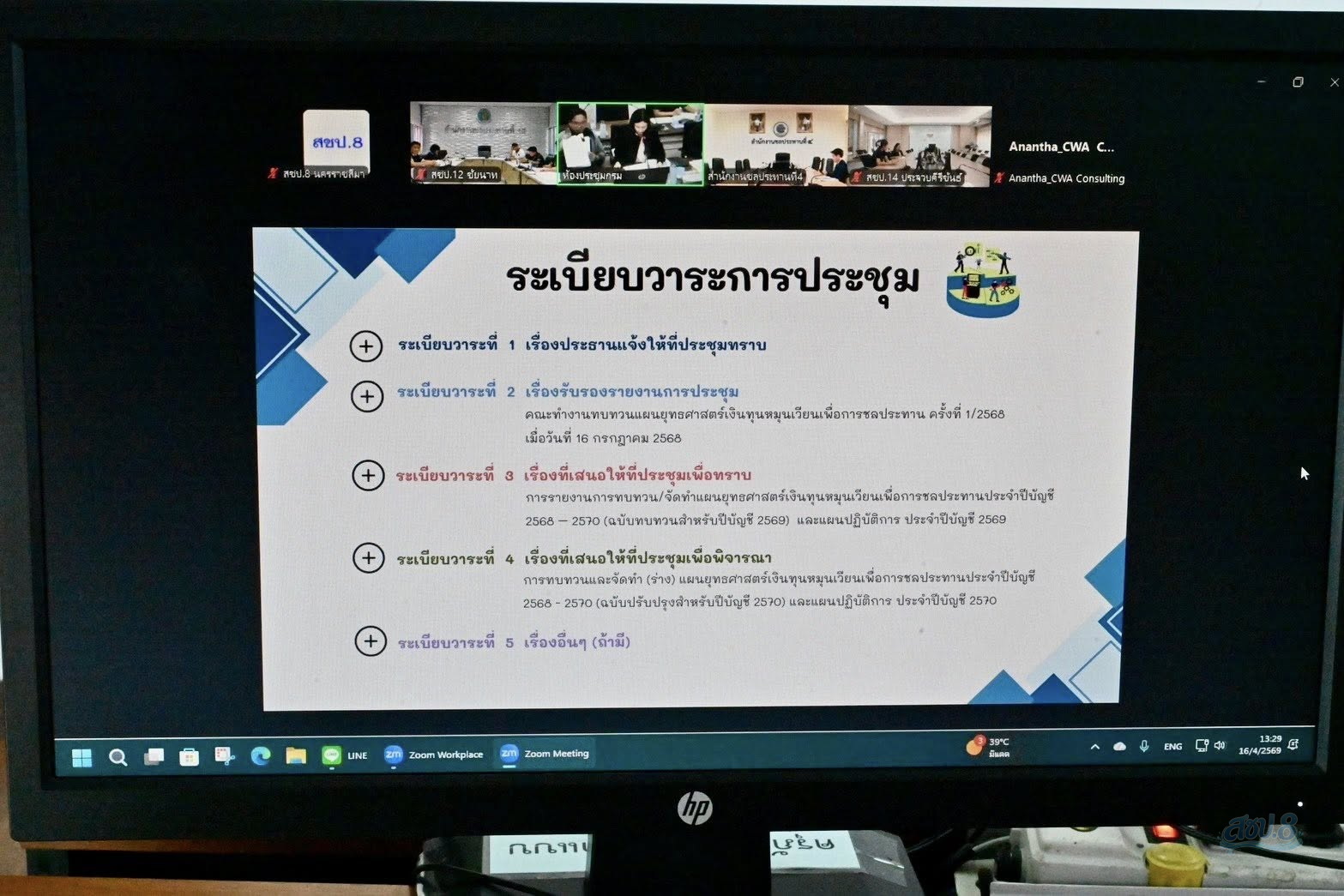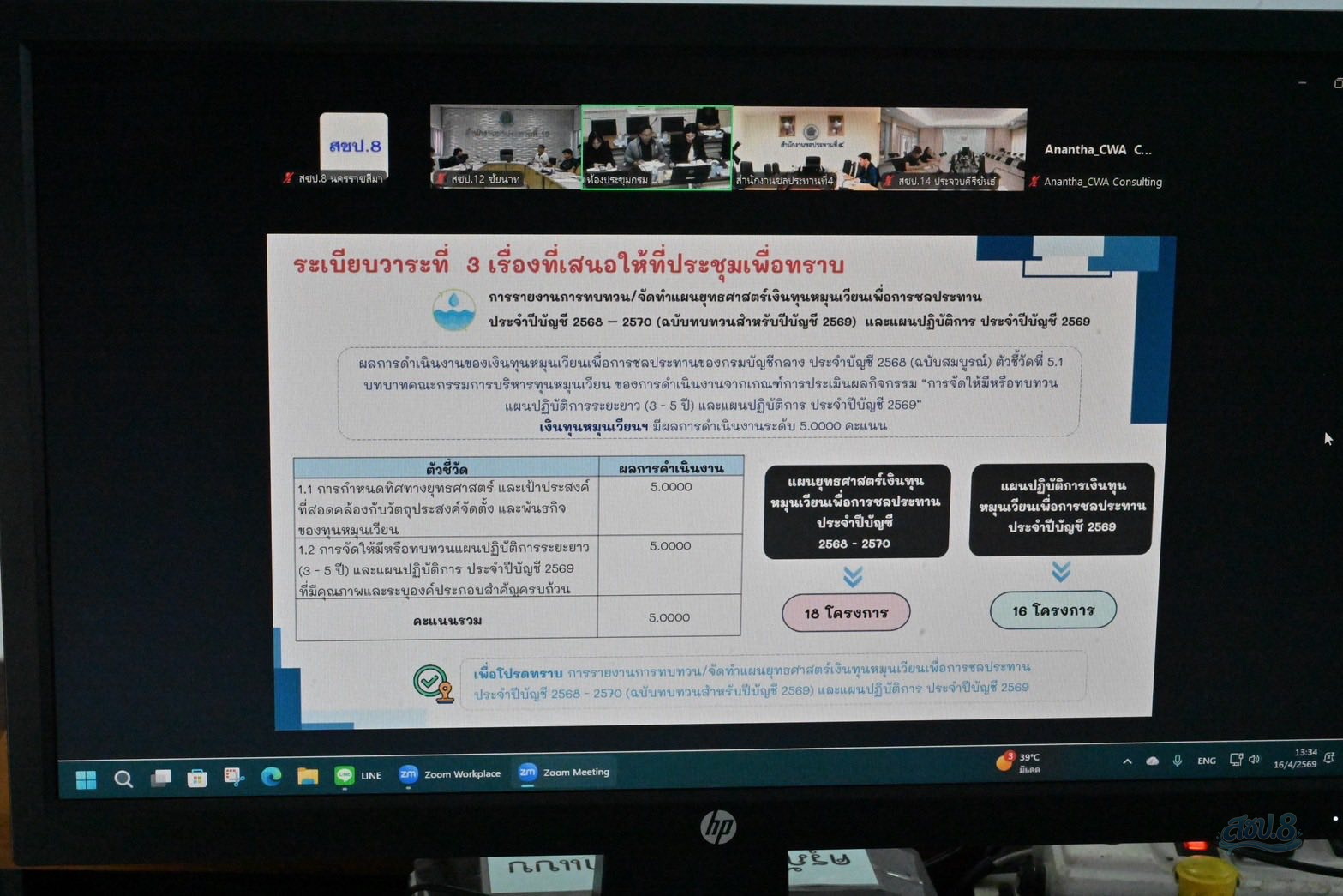 วันพฤหัสบดีที่ 16 เมษายน 2569 เวลา 13.30 น. นายกิตติธัช เทพหัสดิน ณ อยุธยา ผู้อำนวยการสำนักงานชลประทานที่ 8 มอบหมายให้ นายวชิรพงษ์ เพ็งแก้ว ผู้อำนวยการส่วนแผนงาน พร้อมด้วย นางสาวปนัดดา การินทร์ หัวหน้าฝ่ายโครงการพิเศษ และเจ้าหน้าที่ที่เกี่ยวข้อง เข้าร่วมประชุมคณะทำงานทบทวนแผนยุทธศาสตร์เงินทุนหมุนเวียนเพื่อการชลประทาน ครั้งที่ 1/2569 ผ่านระบบออนไลน์ Zoom Meeting จากห้องประชุมกรมชลประทาน ชั้น 3 อาคารอำนวยการ กรมชลประทาน สามเสน กรุงเทพฯ เพื่อรับทราบการรายงานการทบทวนและจัดทำแผนยุทธศาสตร์เงินทุนหมุนเวียนเพื่อการชลประทาน ประจำปีบัญชี 2568-2570 (ฉบับทบทวนสำหรับปีบัญชี 2569) และแผนปฏิบัติการ ประจำปีบัญชี 2569 ตลอดจนเพื่อพิจารณาการทบทวนและจัดทำแผนยุทธศาสตร์เงินทุนหมุนเวียนเพื่อการชลประทาน ประจำปีบัญชี 2568-2570 (ฉบับปรับปรุงสำหรับปีบัญชี 2570) เพื่อให้การทบทวนและจัดทำแผนฯ มีประสิทธิภาพ ณ ห้อง SWOC 8 ชั้น 2 สำนักงานชลประทานที่ 8 ตำบลในเมือง อำเภอเมือง จังหวัดนครราชสีมา