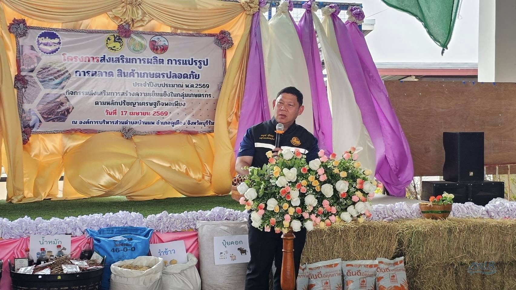 วันศุกร์ที่ 17 เมษายน 2569 เวลา 09.30 น. นายภาณุวัฒน์ บุญรอด ผู้อำนวยการโครงการส่งน้ำและบำรุงรักษามูลกลาง เข้าร่วมพิธีเปิดการอบรมถ่ายทอดความรู้การผลิตปุ๋ยอินทรีย์เพื่อทดแทนการใช้ปุ๋ยเคมี ณ องค์การบริหารส่วนตำบลบ้านแพ ตำบลบ้านแพ อำเภอคูเมือง จังหวัดบุรีรัมย์ โดยมี นายสมบูรณ์ สุธีระกุล รองผู้ว่าราชการจังหวัดบุรีรัมย์ เป็นประธานในพิธี สำนักงานเกษตรและสหกรณ์จังหวัดบุรีรัมย์ ร่วมกับที่ทำการปกครองอำเภอ ได้จัดทำโครงการส่งเสริมการผลิต การแปรรูป การตลาด สินค้าเกษตรปลอดภัย ส่งเสริมสร้างความเข้มแข็งในกลุ่มเกษตรกรตามหลักปรัชญาเศรษฐกิจพอเพียง สามารถพึ่งพาตนเองได้อย่างยั่งยืน และให้ผู้อบรมมีความรู้ความเข้าใจในการผลิตปุ๋ยอินทรีย์เพื่อทดแทนการใช้ปุ๋ยเคมี นำไปประยุกต์ใช้ในพื้นที่ทำการเกษตรของตนเองได้จริงและสามารถขยายผลไปสู่เกษตรกรรายอื่นๆ ในชุมชน