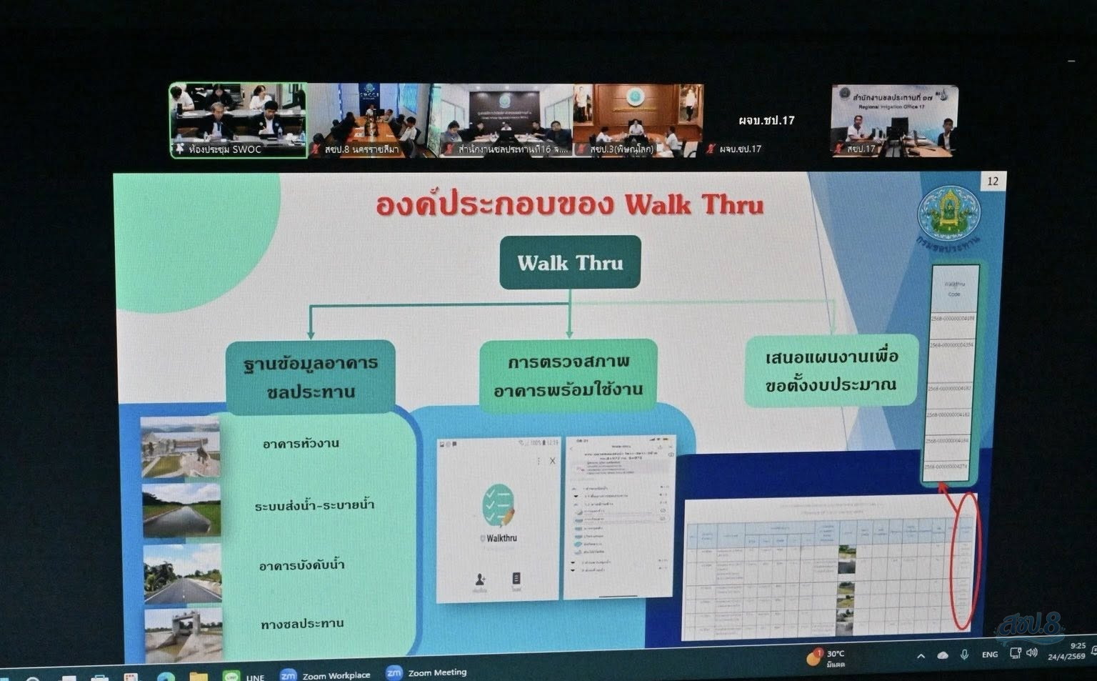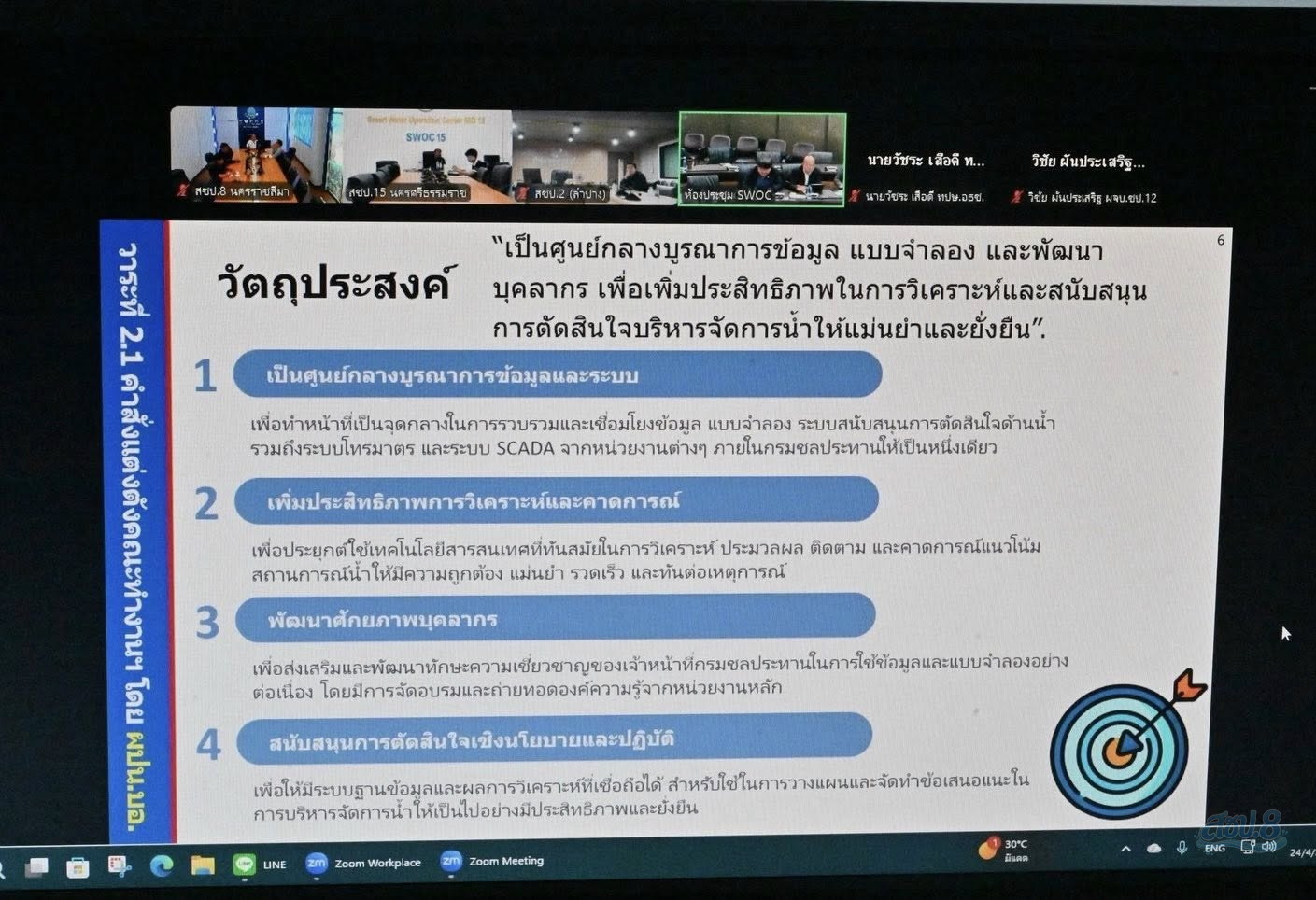 วันศุกร์ที่ 24 เมษายน 2569 เวลา 09.00 น. นายกิตติธัช เทพหัสดิน ณ อยุธยา ผู้อำนวยการสำนักงานชลประทานที่ 8 มอบหมายให้ นายคงฤทธิ์ สุภักดี ผู้อำนวยการส่วนบริหารจัดการน้ำและบำรุงรักษา พร้อมด้วย นายธีรนันต์ เจริญศิริมณี หัวหน้าฝ่ายบริหารจัดการน้ำ นายภาสวุฒิ ขอมเกาะ หัวหน้าฝ่ายปรับปรุงบำรุงรักษา นางสาวดารุณี สายยศ หัวหน้าฝ่ายบริหารบุคคลและสวัสดิการ และเจ้าหน้าที่ที่เกี่ยวข้อง เข้าร่วมประชุมคณะทำงานบูรณาการระบบข้อมูล แบบจำลอง และการพัฒนาศักยภาพบุคลากร ด้านการบริหารจัดการน้ำ ผ่านระบบออนไลน์ Zoom Meeting จากห้องประชุมศูนย์ปฏิบัติการน้ำอัจฉริยะ ชั้น 3 อาคาร 99 ปี หม่อมหลวงชูชาติ กำภู กรมชลประทาน สามเสน กรุงเทพมหานคร โดยมี นายเดช เล็กวิชัย รองอธิบดีฝ่ายบำรุงรักษา เป็นประธานในการประชุม ซึ่งการประชุมในครั้งนี้เพื่อพิจารณาระบบฐานข้อมูลอาคารชลประทาน จุดติดตั้งโทรมาตร และ SCADA ที่มีอยู่ในปัจจุบัน และมีแผนจะดำเนินการ และพื้นที่ที่ สชป.1 - สชป.17 รวมถึงพื้นที่ที่ต้องการจะดำเนินการเพิ่มเติม ฯลฯ เพื่อให้การบริหารจัดการน้ำ เป็นไปตามวัตถุประสงค์ ตลอดจนเพิ่มประสิทธิภาพในการวิเคราะห์และสนับสนุนการตัดสินใจในการบริหารจัดการน้ำในพื้นที่ต่างๆ ได้อย่างแม่นยำและยั่งยืน ณ ห้อง SWOC 8 ชั้น 2 สำนักงานชลประทานที่ 8 ตำบลในเมือง อำเภอเมือง จังหวัดนครราชสีมา